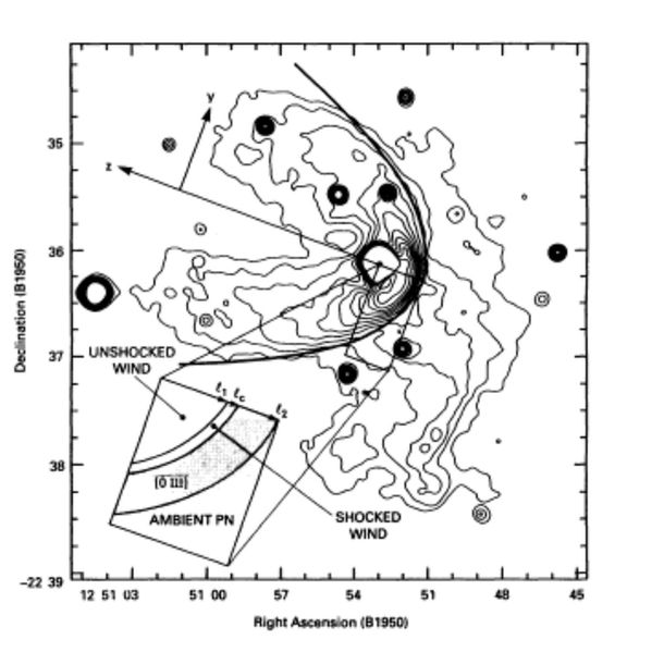 La première impression qui vient à l’esprit lorsque l’on regarde Abell 35 en émission OIII est celle de voir un arc de choc, comme en avaient déjà décrits Gull et Sofia en 1979 autour de LL Ori et de ζ Oph, mais en beaucoup plus net. Ces structures étaient déjà interprétées comme des bulles de gaz interstellaire déformées par un fort vent stellaire. Mais en 1981, Jacoby objectait déjà que BD – 22°3467 était de type spectral G8 IV, un type d’étoile non associé à de forts vents stellaire, et que par ailleurs, les bulles observées par Gull et Sofia incluaient un rehaussement concomitant de l’émission en OIII et des lignes de Balmer, ce qui n’était pas le cas pour Abell 35. De plus, il notait que BD – 22°3467 n’était pas assez chaude pour ioniser la nébuleuse (du fait du type spectral G8) et il émit l’hypothèse de la présence d’un compagnon invisible et chaud qui « alimenterait » la nébuleuse. Cette hypothèse fut vérifiée par la suite, le compagnon chaud ayant une température estimée à plus de 150 000 K.