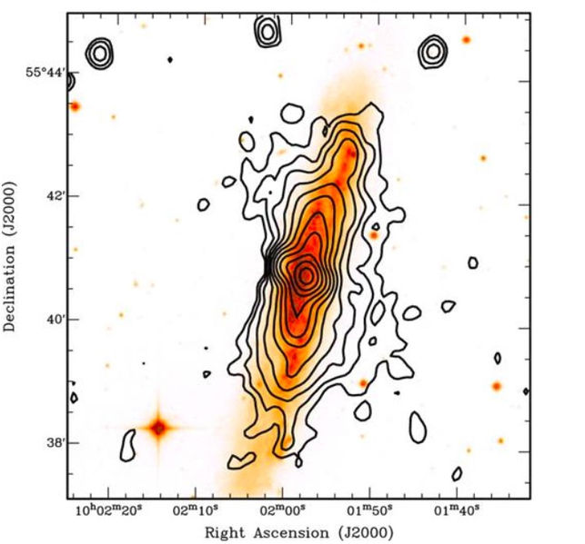 Des observations complémentaires en hydrogène neutre profond (H I) au radiotélescope Westerbork Synthesis permettent toutefois de révéler que ce disque HI est beaucoup plus étendu et perturbé que ce que nous montre Hubble, avec un rayon s’étendant jusqu’à 22 kpc !, asymétrique tant morphologiquement que cinématiquement et avec une légère déformation des bords nord et sud (figure 1 de la galerie scientifique).