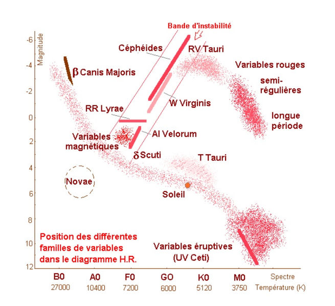 Parmi les plus lumineuses, on trouve notamment les céphéides, les étoiles variables de type RR Lyra et les Miras (du nom commun de o Ceti).