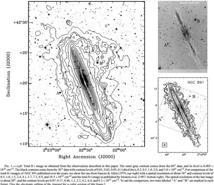Puisqu’il ne fait guère de doute que les distributions lumineuses de NGC 891 et de NGC 7814 sont très différentes, les auteurs se dont donc concentrés sur une réévaluation de leurs courbes de rotation. Si le télescope utilisé est le même (il s’agit du Westerbork Synthesis Radio Telescope (WSRT)) Les dates des différentes observations ont leur importance puisque les courbes de rotation publiées par Van der Kruit pour NGC 891 et pour NGC 7814 ont été obtenues à partir d’observations de la raie HI entre 1979 et en 1982. Et si la courbe de rotation de NGC 891 avait été obtenue directement des observations (en utilisant une méthode « d’enveloppe » de vélocité), celle de NGC 7814 l’avait été à partir de modèles dérivés. Ainsi, les deux courbes semblaient similaires en première approximation, mais les observations H I, en particulier celles de NGC 7814, avaient des rapports signal / bruit médiocres dans les régions centrales et les courbes présentaient de grandes incertitudes ou ne pouvaient pas être dérivées du tout.