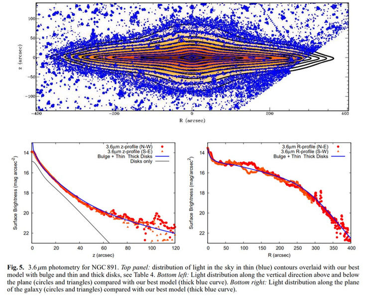 Ainsi, lorsque l'on compare nos deux spirales (cf. NGC 7814), il est facile de constater qu'elles sont représentatives de deux morphologies « extrêmes » au sein des galaxies spirales, avec une NGC 891 qui est « à dominante discale » alors que NGC 7814 est à l’inverse presque entièrement « bulbaire ». En supposant qu’il est acquis que l’on peut déduire la distribution de la masse d’une galaxie spirale en étudiant sa courbe de rotation (par "photométrie multicolore", notamment à travers les données collectées dans la raie HI à 21 cm), comparer leurs courbes de rotation prend tout son sens puisqu’il ne devrait pas être possible pour deux galaxies de morphologie si différente d'avoir des courbes de rotation similaires (dès lors qu’il est postulé que la distribution de la matière lumineuse est liée à la distribution de la masse totale).